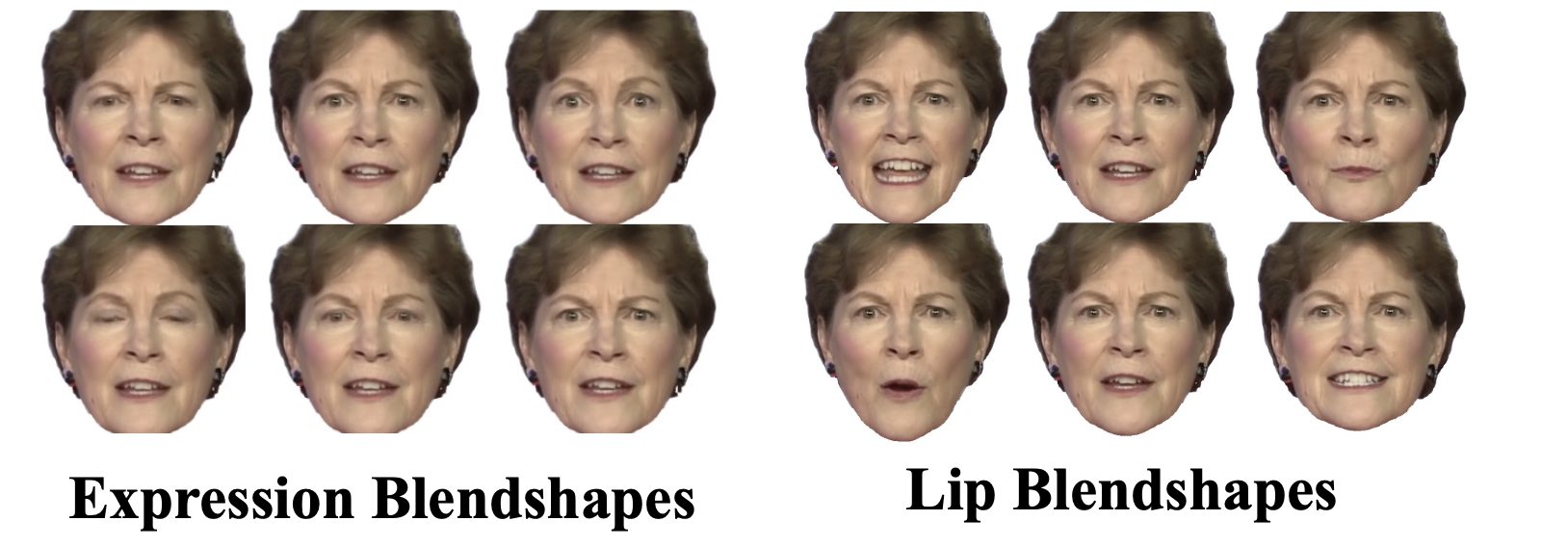 The learned components possess well-defined semantic meaning, and we show the changes of the two blendshapes as the coefficients vary.