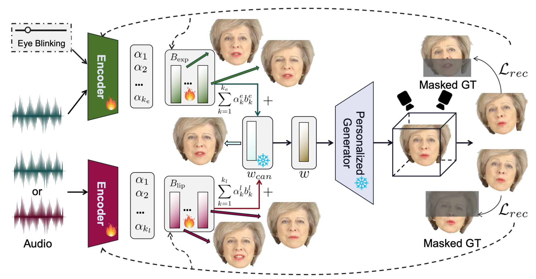 Overall Framework of DGTalker. We design a disentangled navigation framework consisting of an anchor $w_{can}$, which encodes a global canonical expression for a specific identity, and two sets of learnable, orthogonal blendshapes ${B_\text{exp}, B_\text{lip}}$ containing $k_e$ and $k_l$ vectors, respectively. Each vector corresponds to a disentangled variation in upper/lower face expressions. The input audio is used to regress the coefficients of these blendshapes. To ensure effective learning, we randomly feed the encoder with different audio inputs and render the output images from two viewpoints. The corresponding masked ground-truth (GT) images are then used for supervision.
